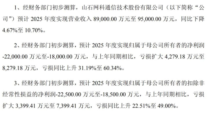 山石网科:亏损 2.2 亿至 1.8 亿,亏损扩大,同比上升 31.19% 至 60.34%。