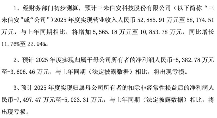 三未信安:亏损 5383 万至 3606 万