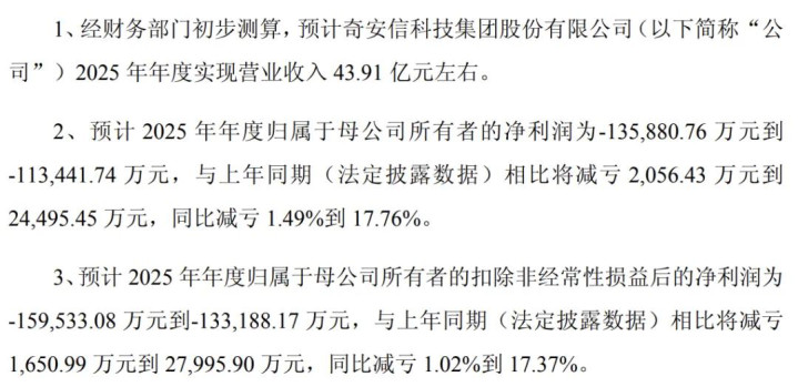 奇安信:亏损 13.59 亿至 11.34 亿,减亏 2056 万至 2.45 亿。